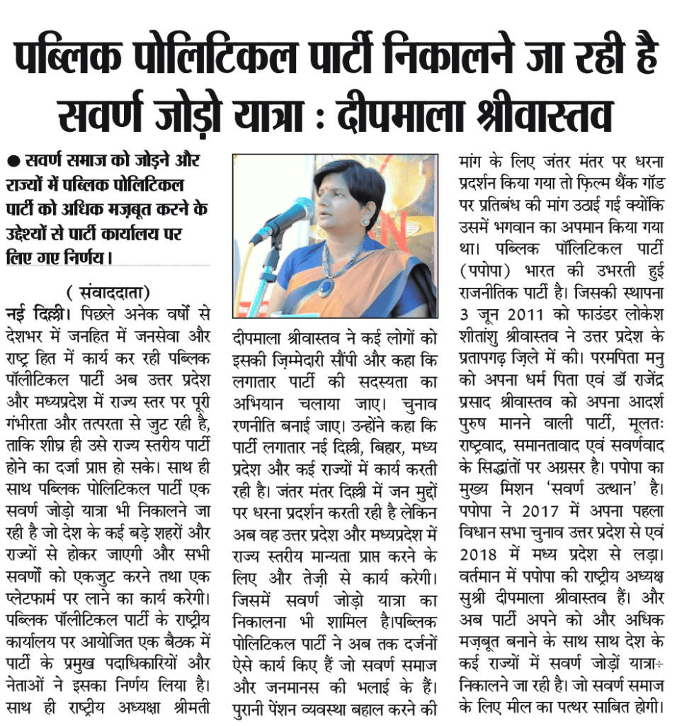 पब्लिक पोलिटिकल पार्टी द्वारा लिए गए फैसले कि सवर्ण जोड़ो यात्रा निकाली जाएगी पर कई लोगों ने ये पूछा है कि आखिर सवर्ण जोड़ो यात्रा क्यों निकाली जा रही है और ये किस उद्देश्य से कहां निकाली जाएगी। तो इसके उत्तर में अध्यक्षा श्रीमती दीपमाला श्रीवास्तव ने कहा है कि आज जब सवर्ण समाज अनेक समस्याओं से जूझ रहा है और अपने दैनिक जीवन में समस्याग्रस्त है और राजधानी दिल्ली तक में सवर्ण समाज का अपमान किया जा रहा है यहां तक कि ब्राह्मण भारत छोड़ो बनिया भारत छोड़ो के नारे दिए जा रहे हैं तब यह आवश्यक हो जाता है कि इन देश और सवर्ण समाज विरोधी तत्वों को मुंह तोड़ जवाब दिया जाए। ऐसे में पब्लिक पोलिटिकल पार्टी ने फैसला किया है कि वह सवर्ण समाज को एक प्लेटफार्म पर लाने और जागरूक करने के लिए सवर्ण जोड़ो यात्रा निकालेगी। सम्पूर्ण सवर्ण समाज को अपमानित और शोषित होने से बचाने के लिए देश के कई राज्यों के बड़े शहरों में इस यात्रा को निकाला जाएगा। पब्लिक पोलिटिकल पार्टी इस यात्रा का आयोजन सवर्ण समाज के लोगों को जागरूक करने के उद्देश्य से अति शीघ्र करने जा रही है। जो सवर्ण समाज के लिए मील का पत्थर साबित होगी।