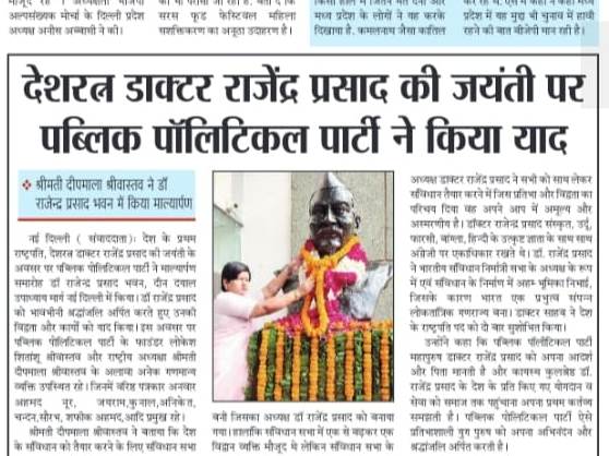 श्रीमती दीपमाला श्रीवास्तव जी ने बताया कि देश के संविधान को तैयार करने के लिए संविधान सभा बनी जिसका अध्यक्ष डॉ राजेंद्र प्रसाद जी को बनाया गया। हालांकि संविधान सभा में एक से बढ़कर एक विद्वान व्यक्ति मौजूद थे लेकिन संविधान सभा के अध्यक्ष डाक्टर राजेंद्र प्रसाद ने सभी को साथ लेकर संविधान तैयार करने में जिस प्रतिभा और विद्वता का परिचय दिया वह अपने आप में अमूल्य और अस्मरणीय है। डाॅक्टर राजेन्द्र प्रसाद संस्कृत, उर्दू, फारसी, बांग्ला, हिन्दी के उत्कृष्ट ज्ञाता के साथ साथ अंग्रेजी पर एकाधिकार रखते थे। डॉ. राजेंद्र प्रसाद ने भारतीय संविधान निर्मात्री सभा के अध्यक्ष के रूप में एवं संविधान के निर्माण में अहम् भूमिका निभाई, जिसके कारण भारत एक प्रभुत्व संपन्न लोकतांत्रिक गणराज्य बना। डाक्टर साहब ने देश के राष्ट्रपति पद को दो बार सुशोभित किया। उन्होंने कहा कि पब्लिक पॉलीटिकल पार्टी महापुरुष डाक्टर राजेंद्र प्रसाद को अपना आदर्श और पिता मानती है और कायस्थ कुलश्रेष्ठ डॉ. राजेंद्र प्रसाद के देश के प्रति किए गए योगदान व सेवा को समाज तक पहुंचाना अपना प्रथम कर्तव्य समझती है। पब्लिक पोलिटिकल पार्टी ऐसे प्रतिभाशाली युग पुरुष को अपना अभिनंदन और श्रद्धांजलि अर्पित करती है।