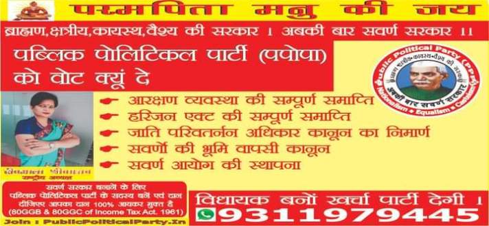 पब्लिक पॉलिटिकल पार्टी (पपोपा) के गठन का मूल उद्देश्य ‘मिशन सवर्ण उत्थान’ है. सवर्ण समाज आज का नया दलित समाज है जिसे अन्य राजनीतिक पार्टियों द्वारा दबाया जा रहा है. सवर्णों को दलित बनाने के लिए कांग्रेस और भाजपा जैसी पार्टियाँ तरह तरह के षड़यंत्र करती रहती हैं. कभी कानून बना कर, कभी नस्लवादी भेद कराकर.