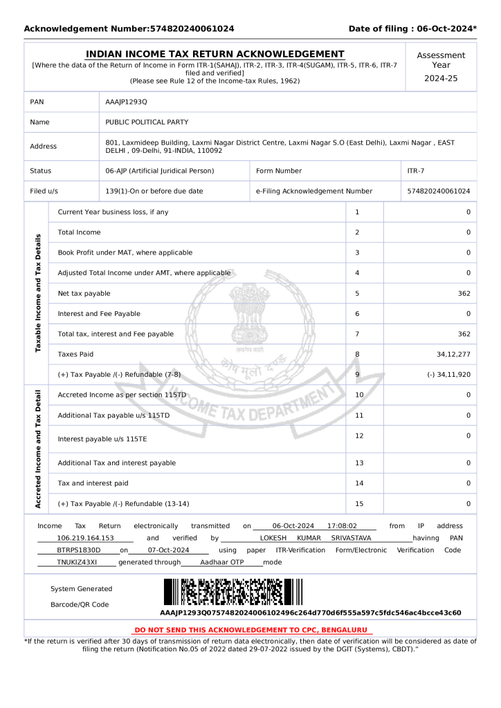 Public Political Party Central Office Address: 804, District Centre, Laxmi Deep Building