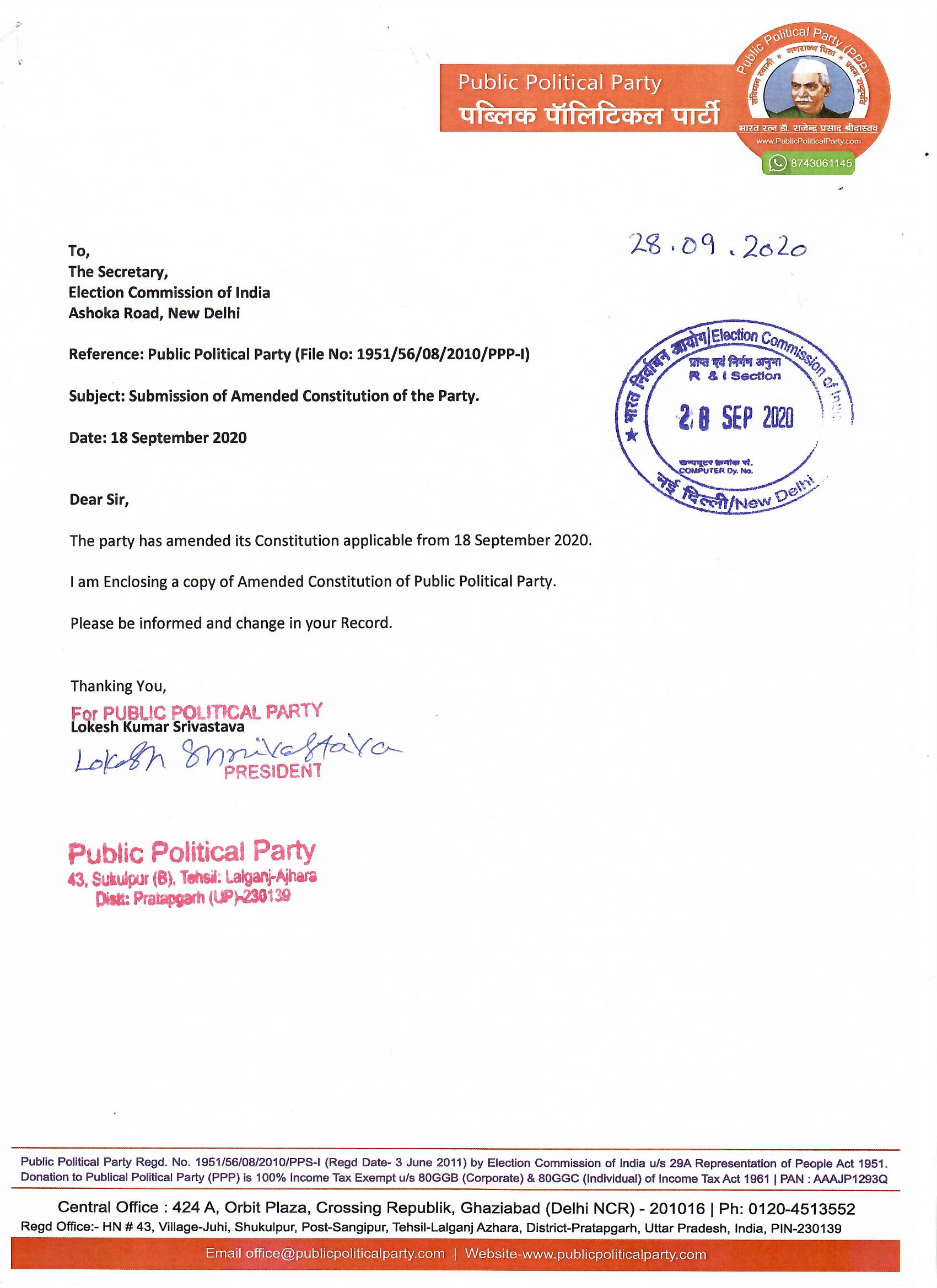 - Till the first National President’s election is held as per the provisions of the Constitution, Shri Lokesh Kumar Srivastava shall act as The President of Public Political Party having full authority to constitute his own National/State/District Committees as may be deemed expedient by him in consultation with the Advisory Board.